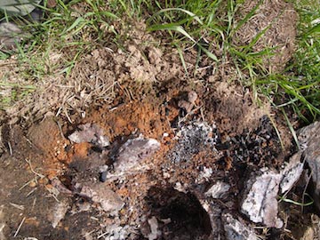 In most cases, all that can be expected to be recovered, after hundreds (if not thousands) of years, will be the vary base level of the furnace, basically the slag bowl below tuyere level, with perhaps the base level wall section that surrounded that. Usually there is no sign of the tuyere, or any indication of how it might have been mounted. If the walls had been constructed some clay mixture, there may be some indication by way of that inner part of the walls that had reached high enough temperatures to sinter into a ceramic. The action of rain has simply washed away any raw clay that composed the outer section of the original walls. Even the sintered portions are sure to have been subjected to years of alternating freeze and thaw cycles, further fragmenting even these remains. " (1)